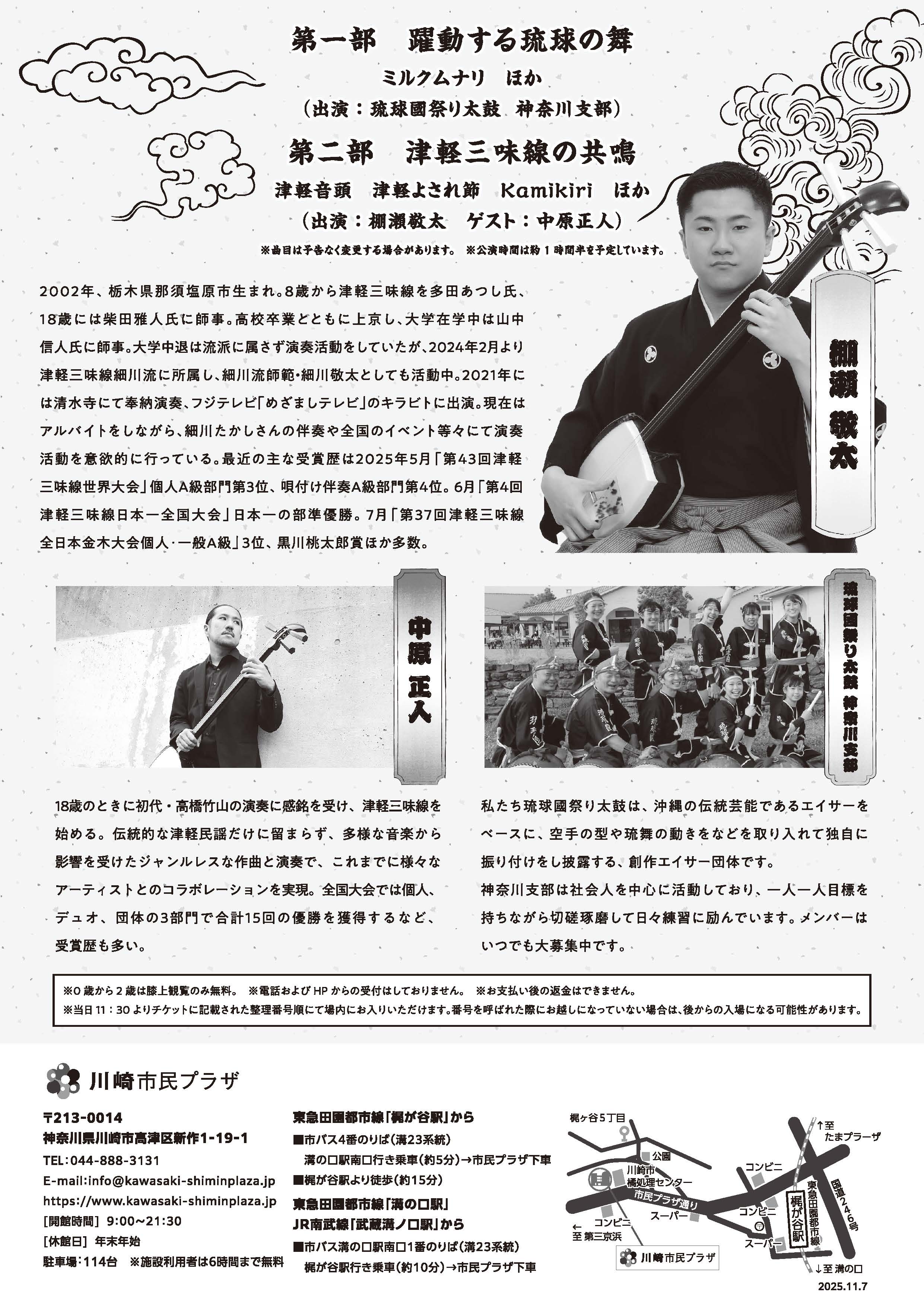 イベント内容 | 全国の津軽三味線大会で優秀な成績を収めている若手ホープ・棚瀨敬太と、神奈川で活動するエイサー団体「琉球國祭り太鼓 神奈川支部」のコンサートを開催します。 日ごろ邦楽に触れる機会の少ない方や、未就学児のお子さまのいる家族連れにも気楽に参加いただけるコンサートとなっています。 出演 棚瀨 敬太(津軽三味線) ゲスト:中原 正人(津軽三味線) 琉球國祭り太鼓 神奈川支部 料金 前売 500円・当日 700円 ※全自由席。 ※0~2歳は膝上観覧のみ無料、申込み不要。 2025年10月15日(水曜)10:00~川崎市民プラザ窓口にてチケット発売。 ※電話およびホームページからの受付はしておりません。 ※お支払い後の返金はできません。 ※当日11:30よりチケットに記載された 整理番号順にて場内にお入りいただきます。番号を呼ばれた際にお越しになっていない場合は、後からの入場になる可能性がありますのでご了承ください。 ※前売り券完売の場合、当日券の販売はありません。 |